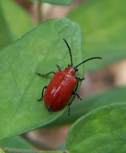 The scarlet lily leaf beetle Lilioceris lilii, was first found in Manitoba in Portage la Prairie in 1997, and spread to Winnipeg in 2004. It has most recently been found in Brandon. Its distribution is aided by the commercial movement of infested potted lily plants.