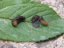 - Emerging larvae will begin feeding on the underside of the leaves and then move to the top. This stage lasts for about 16-24 days. They will cover themselves with their own feces to discourage predators.