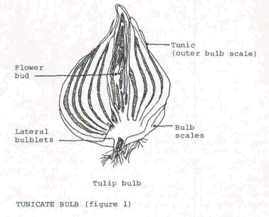 The easiest way to understand a bulb is to think of a plant stem, then visually compress or squash it into a roundish "bulb" Bulbs actually consist of a short stem surrounded by thick fleshy leaves. The stem axis is called a basal plate and the fleshy leaves are termed scales. The main growing pint is located in the centre of the bulb and expands upward into the current seasons shoots(s). The scales function as food storage for the plant. Small bulbs known as bulblets can develop in the axil of these scales in lilies, or from the basal plate as in other bulbs. In lilies, these bulblets can grow and develop into what are called daughter bulbs. There are two types of bulbs - 'tunicate' and 'non-tunicate'. Tunicate bulbs((figure 1) have outer bulb scales which are dry and membranous, like onions and tulips. This 'tunic' protects the bulbs from both mechanical injury and drying. Bulbs of this are usually quite solid. Roots are not present during the dormant phase, but developed adventitiously during active growth.