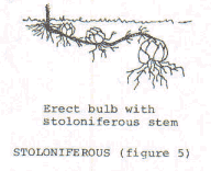 'Stoloniferous' bulbs (figure 5) are those bulbs which are essentially erect bulbs connected underground by a stolon or underground stem. The species L. wardii and L. duchartrei are examples of this group.